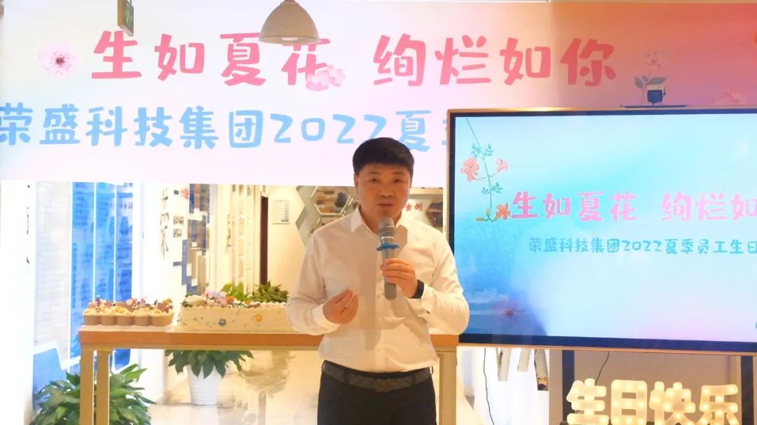綠樹濃蔭聞蟬鳴,清風(fēng)一夢花意濃。在這姹紫千紅、萬物崢嶸的盛夏時節(jié),為營造溫馨和諧的工作環(huán)境和氛圍,讓每一位員工切實(shí)的感受到榮盛大家庭的溫馨,助力企業(yè)形成良好的向心力和凝聚力。7月2日下午,榮盛科技集團(tuán)隆重舉辦了「生如夏花 絢爛如你——2022夏季員工生日會」。集團(tuán)董事長楚科奇與來自各個部門的60余名壽星共聚一堂,共同見證這甜蜜的時刻。