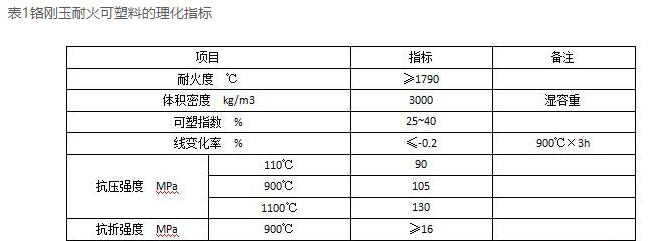 眾所周知,鉻剛玉是一種耐火原料,主要由氧化鉻和剛玉組成。鉻剛玉具有高熔點(diǎn)和硬度,在高溫下體積穩(wěn)定,不膨脹收縮,能很好地抵抗酸性和堿性氣體的侵蝕,不易與爐渣發(fā)生反應(yīng)。以鉻剛玉為基料生產(chǎn)的鉻剛玉耐火性高,耐磨性好,在高溫下耐酸堿侵蝕,可延緩襯里損壞,延長(zhǎng)使用壽命。表1是鉻剛玉耐火塑料的物理化學(xué)指標(biāo)。